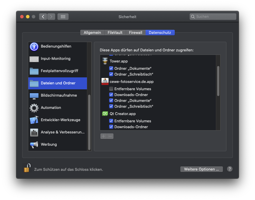 ich habe die neueste Version (7.00.01) direkt aus dem Appstore über meinen Mac geladen. In den Datenschutzeinstellungen für Fotos hat die App die Freigabe. Bei Dateien und Ordner wird sie mir nicht angezeigt und ich kann sie auch nicht hinzufügen. Anbei einen Screenshot Leider funktioniert es immer noch nicht und ich kann mein alljährliches Jahrbuch nicht anfertigen. Ich hoffe, dass Sie mir helfen können.
