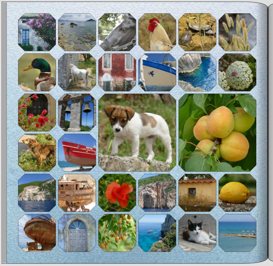 bei einem quadratischen Format ist es ganz wirkungsvoll, wenn auch die Einzelbilder der Collage quadratisch sind. Hier bietet CEWE eine einfache Möglichkeit zur Zusammenstellung , ohne die wenig flexible Collage-Funktion benutzen zu müssen: Bei den Seitenlayouts gibt es eine gute Auswahl mit vielen Fotoplatzhaltern (bis zu 36 Bilder). Ich habe mal auf die Schnelle ein Seitenlayout mit 30 Bildern (davon 2 besonders groß) befüllt. Die Bilder können anschließend wie gewohnt beliebig getauscht und innerhalb der Platzhalter verschoben und gezoomt werden. Außerdem können nach Markierung des gesamten Seiteninhaltes weitere Dekorationen ausprobiert werden (hier zum Beispiel die Anwahl eines Farbrandes und das Abschrägen der Ecken). Re: Collagen im Fotobuch erstellenHallo Buja,