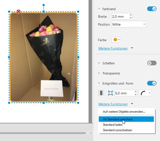 Re: Standard für Dekorieren speichernIch sehe gerade an deinem Screenshot, dass du nicht den gewählten Farbrand gespeichert hast, sondern die Eckenfunktionen.
