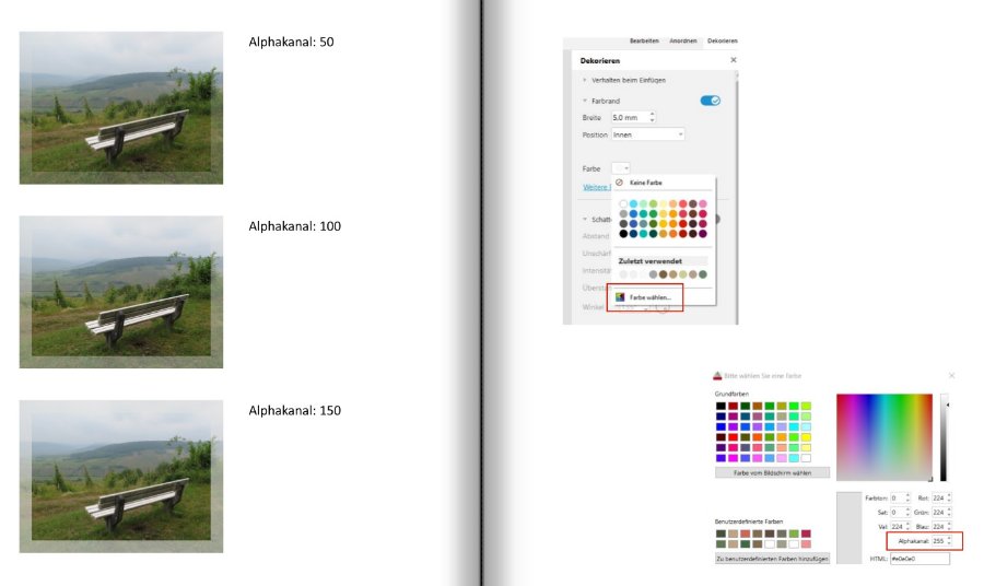 Hello spica,I see a frame inside (Innen) in a light grey, which covers the 10 mm part of the picture. When you mark the picture and move the cursor a little bit, the frame gets partly transparent. That´s what is seen on your first screenshot. Do you want a transparent frame? Or what else do you want to configure? I really easy understand that it is difficult to understand what I mean. But the thing is, that I want a transparent frame. Kind regards