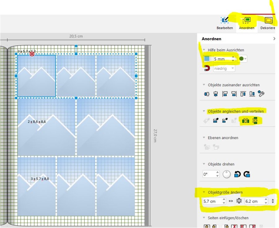 willkommen hier im Forum. Ich hoffe, ich habe Dich richtig verstanden. Mein Lösungsvorschlag: ich würde wie folgt vorgehen: Seitenabstand: unter Anordnen das Raster auf 5mm einstellen. Bei 1,5 cm wären dies dann 3 Kästchen. (seitlich und oben) usw. Da kannst man dann das erste Foto einrasten lassen. Bei den Zwischenabständen könntest Du das Werkzeug verwenden. Objekte angleichen und verteilen Zähle die einzelnen Abmessungen (Objektgröße ändern) der Fotos zusammen und rechne dann die 2mm Abstände dazu. Dann Fotos waagrecht oder senkrecht ausrichten. Bei meinem Beispiel, stimmt es nur nicht bei den 2 mittleren Foto´s. Da sind es 2,5 mm Abstand. Mal sehen, was die Profis da noch für Ideen haben. Ganz bestimmt bekommst Du noch andere Vorschläge insbesonders, wie man dies auf das gesamte Buch anwenden kann. Viel Erfolg beim ausprobieren. Liebe Grüße Asiafan