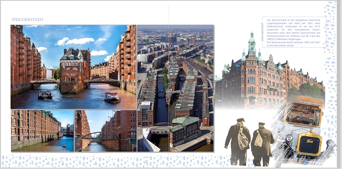 - Die Oberkante des Textrahmens findet kein Gegenüber auf der linken Seite. Da du über die Mitte gearbeitest hast, gehören die Seiten ja zuammen und da sollte der Rand (oder wenn ohne Rand, dann der Textblock) entweder mit dem Bild oder mit dem Text "Speicherstadt") bündig sein. Du könntest natürlich auf die Bilder links etwas hochziehen.