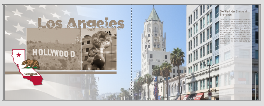 Besser? Den Fehler mit dem breiten Textfeld mache ich immer wieder. Wurde auch (zu Recht) bei meinem Bali FB schon bemängelt, aber irgendwie merke ich das selber nie Die Einleitungsseite finde ich toll. Allerdings würde ich das graue Clipart etwas breiter ziehen, oder das Textfeld etwas schmäler, so dass der Text nicht so nah an der Kante hängt. Probiere mal aus, wie es aussieht, wenn Du die Fotos und die Karte unterhalb von Los Angeles eine Idee tiefer setzt! Die Berliner Mauer hab ich mal kleiner gemacht, aber in der Mitte finde ich sie irgendwie komisch? Vielleicht doch wieder ein Stück weiter nach rechts? hat geschrieben: Bei Bild 5 würde ich das bunte Foto links innerhalb der beiden Linien anordnen. evtl. auch mittiger.