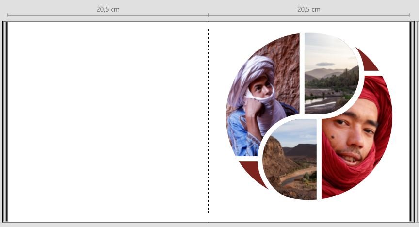 Ich habe wie folgt gearbeitet: --> Clipart Kreis als Basis und Hintergrund für die beiden sichtbaren einfarbigen Zipfel auf der Seite platziert --> 4 Fotoplatzhalter angelegt, wie im Screenshot dargestellt. Die Berechnung dazu: Die Quadrate mit Halbkreis erhalten das halbe Seitenmaß vom Kreisclipart, die Rechtecke mit Innenrundung erhalten die Breite der Quadrate und eine 1,5fache Länge von ihrer eigenen Breite. Die Rundungen lege ich generell mit 500 mm; das passt bei jeglicher Fotogröße (auch seitenfüllend), um eine vollständige Rundung zu erhalten. --> Alle 4 Fotoplatzhalter erhalten einen Rahmen Mitte, in meinem Beispiel 3mm. So kann ich die Fotos direkt aneinander andocken und die Rahmen überlappen sich gleichmäßig. --> Die 4 Fotoplatzhalter befülle ich und richte sie mit den jeweils angegebenen Tastenkombis (ALT+OV usw.) auf dem Kreis aus. Dazu markiere ich jeweils zuerst den Kreis, halte STRG gedrückt und markiere dann den jeweiligen Fotoplatzhalter. (Abb. li.) --> Die von Sylke gezeigte versetzte Optik erhalte ich, indem ich die Fotos anschließend verschiebe. Für mein Beispiel habe ich bei gedrückter STRG-Taste 2 und 4 gemeinsam markiert mit der Pfeiltaste 10x nach rechts sowie 1 und 3 gemeinsam markiert mit der Pfeiltaste 10x nach links geklickt. (Abb. re.) Die Schnecke im Yin und Yang Design geht grundsätzlich im Ansatz gleich, nur die Ausrichtung der Fotos und Rundungen ist anders. (Abb. li) Für den Basiskreis nehme ich hier jedoch ein vollständig gerundetes Foto statt des Cliparts, um evtl. Farbabweichungen beim Druck zu vermeiden, die teilweise zwischen Fotos und Cliparts vorkommen. Bei Yin Yang lasse ich auch die Rahmen und die seitwärtigen Verschiebungen weg, sodass die einzelnen Fotos am Ende wie nur 2 aussehen. Das Kreisfoto im Hintergrund sowie die Fotos 3 und 4 werden alle mit einem identischen einfarbigen Foto bestückt. Den Zipfel unten rechts decke ich mit einem zusätzlichen Clipart ab, dessen Farbe ich aus dem anliegenden Bereich des Fotos 2 picke. Fotoplatzhalter 1 und 2 bestücke ich jeweils mit dem gleichen Foto und richte diese so aus, dass sie passen und wie ein Foto aussehen. Foto 2 erhält außerdem einen Verlauf nach unten, um den Übergang zum darunterliegenden Clipart weicher zu gestalten. (Abb re.) Liebe Grüße