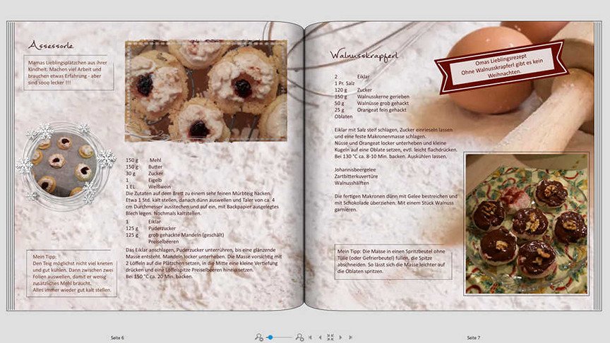 Nun brauche ich euch auch mal wieder, mir hilft das Forum immer ungemein. Ich mache gerade für meinen Sohn eine Sammlung unserer Lieblingsplätzchen. Da Weihnachten und Plätzchenbacken eher etwas romantisch und verspiel ist, verlasse ich meine klare Gestaltungslinie etwas. Nun bin ich mir dabei aber absolut unsicher, da es eben nicht so ganz mein Ding ist. Hier gibt es nun unterschiedliche Hintergründe und auch ein paar Cliparts. Was meint ihr? Ist das zu viel? Unpassend? Verwirrend? Ich bin mir auch noch nicht ganz sicher, welche Schrift in nehme. Die Überschriften habe ich in verschiedenen Schriften ausprobiert, "Elmore" würde mir persönlich gefallen, ist eber wieder eher nüchtern. Beim Titel hätte mir "Grand Hotel" gefallen, wenn ich das aber auch im Buch für die Überschriften nehmen würde, stört mich das "A", das ein großes "a" ist. Ich habe auch einen persönlichen Text auf der ersten Seite, da wollte ich teilweise auch eine Schreibschrift nehmen. Also was ich bräuchte, wäre eine gut lesbare, attraktive Schreibschrift, die für Tiel, persönlichen Text und Überschriften bei den Rezepten passe. Im Buch habe ich Calibri light genommen, in dunkelgrau. Ich tendiere aber nun doch fast zu Calibri, die etwas besser lesbar ist, gerade bei farbigem Hintergrund. Seid doch bitte so lieb und schaut mal drauf. Ich weiß ja, dass ihr ehrlich seid und mir auch sagt, wenn es sch.... aussieht Das Buch wird übrigens klein, 21x21 cm Re: Backbuch - was meint ihr?Ach wie schade... Da hatte ich gedacht, ich könnte ein paar leckere Plätzchenrezepte abstauben, aber Pustekuchen. Die Screenshots sind so klein, da kann ich nix lesen...