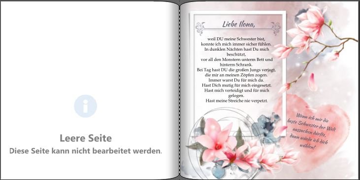 Re: 28. November | Kategorie: KreativesIm Frühjahr 2020, habe ich ein kleines Büchlein für meine, schwer erkrankte Schwester gestaltet. Ich habe ihr das kleine Buch kurz bevor sie ins Krankenhaus mußte geschickt, um ihr ein wenig Mut und Trost, für die anstehende Operation, zu spenden. Im Buch gibt es Bilder zu sehen, die uns zwei zusammen zeigen, aus früher Kindheit, Jugendjahren, unserem Erwachsenem Leben, ein paar Texten und ganz viele Blumen Sie hat sich wahnsinnig gefreut darüber. Die Operation hat sie inzwischen gut überstanden.