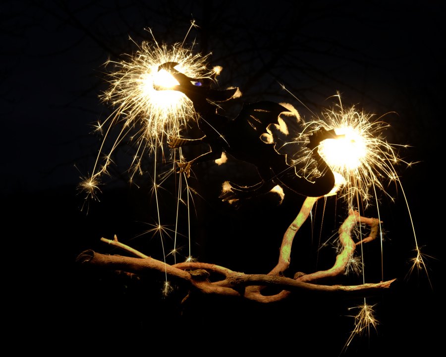 Warum können Drachen Feuer spucken? Klar, sie benutzen Wunderkerzen. Leider sind solche Pappdrachen, zumal wenn sie mit Watte verziert sind, ein bisschen feuergefährdet. Dieser hat sich nach der ersten Session gleich die Schnüss verbrannt, auf den folgenden Fotos fehlt dann leider der obere Teil des Mauls. Das sieht dann nicht mehr so gut aus. Ich wollte ja die Rückseite mit Alufolie bekleben, aber mein Mann sagt, nein, das brennt nicht 44 mm ISO 200 F/6.4 15 sec (manuell belichtet) Stativ und Kabelauslöser Viele Grüße - Gletscherfrau