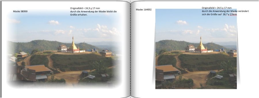 ich habe auch mal versucht dies nachzustellen. Ich denke es ist abhängig von der Maske. Mir ist schon mehrmals aufgefallen, dass sich bei manchen Masken die Größe verändert. Wenn man dann die Maske wieder entfernt bleibt die Größe welche vorher durch die Maske geändert wurde. Traumfänger hat dies ja schon so erklärt! siehe meinen Screenshot. Originalbild = 24,5 x 17 mm durch die Anwendung der Maske 98990 bleibt die Größe erhalten. Habe das linke Bild kopiert und den anderen Rahmen 164092 verwendet. Originalbild = 24,5 x 17 mm durch die Anwendung der Maske verändert sich die Größe auf 18,7 x 17mm Maske veränderte Größe.JPG Hallo Asiafan, du kannst dann aber das rechte Bild mit der Schattenmaske wieder vergrößern. Bei einer Schattenmaske finde ich das unproblematisch, bei manchen Masken sieht eine Veränderung der vorgesehenen Proportionen aber merkwürdig aus. Lieber Gruß Traumfänger Re: Löschen von MaskenHallo xandria66,