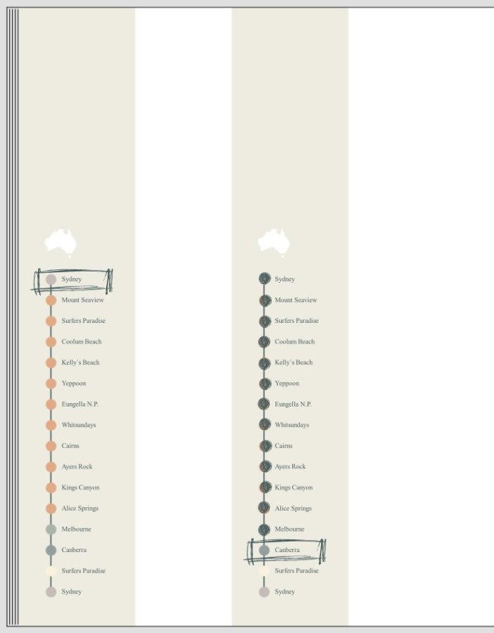 Für mein Jahrbuch 2018 hatte ich eine vertikale Gestaltung der Monate in unterschiedlichen Farben entworfen. Etwas in der Art könnte ich mir auch gut für einen Reiseverlauf vorstellen.