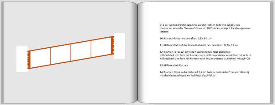 sorry für die Verspätung, ich war gesundheitlich etwas angeschlagen. Aber nun kommt sie, die Fransen-Anleitung wie versprochen. Ich habe dabei nochmals alle Arbeitsschritte in den Ebenen von unten nach oben zusammengefasst. So fällt die Ausrichtung und Verteilung m.M.n. leichter. Ich habe dabei grasmueckes Beschreibung zugrunde gelegt. Die fertige Komposition kannst Du mit der Gummibandmethode gemeinsam markieren und auf jeder beliebigen Seite an jeder beliebigen Stelle platzieren. Die zunächst zentrierte Anlage macht nur das gemeinsame Ausrichten der Elemente leichter. Der Hintergrund sollte zumindest an der Stelle der Fransen weiß sein, da die überstehenden eckigen Kanten sonst sichtbar werden. Du kannst für die Fransen-Fotos auch andere (kleinere) Maße verwenden. Ich fand die Verteilung und Größe der Fransen nur so für mich am schönsten. Wenn Du noch Fragen dazu hast, gerne her damit. Liebe Grüße