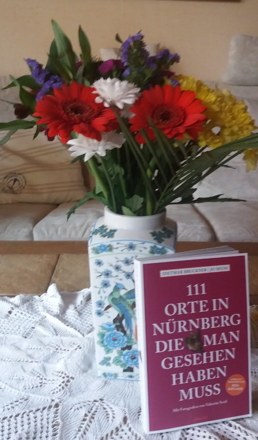 Re: Challenge 04/2021 • Stilles ÖrtchenMein aktueller Lesestoff mit einem wunderschönen Blumenstrauß -- von Freunden bekommen.