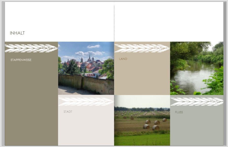 Ich hab mal gespielt: Stadt: heller Bereich des Gehwegs Land: ein Ocker-Ton aus den Heuballen Fluss: graugrüner Bereich im Fluss Alle Flächen sind 50% transparent. Geht aber ganz sicher auch noch deutlich dezenter. Für "ETAPPENWEISE" habe ich die 3 Flächen übereinander gelegt, um einen Mischton zu erhalten, mit den Ebenen gespielt und den Farbton gewählt, den ich passend zu den anderen fand. Die Schriftfarben für STADT, LAND, FLUSS entsprechen den darunterliegenden Farbflächen, nur deutlich dunkler gezogen, damit sie lesbar sind. Die Radspur scheint mir eigentlich entbehrlich. Wenn Du sie magst, würde ich das imaginäre Radl aber nach rechts fahren lassen, so wie auch die Seiten im Buch voranschreiten. Liebe Grüße