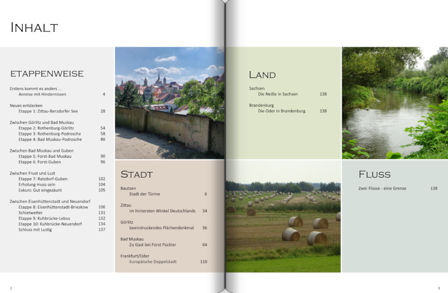 Ich beabsichtige, die Reihenfolge chronologisch vorzunehmen, so dass man - wenn man das gesamte Buch durchblättert - die Tour Stück für Stück anschauen und nachvollziehen kann. Wenn ich dann aber z.B. nur mal die Bilder von Bautzen oder Frankfurt sehen oder ein paar Informationen über die Flüsse erhalten will, kann ich dies anhand des Inhaltsverzeichnisses schnell finden. Ist das für euch logisch oder gibt es dazu weitere Vorstellungen? Lieber Gruß Traumfänger