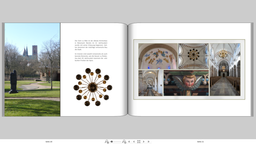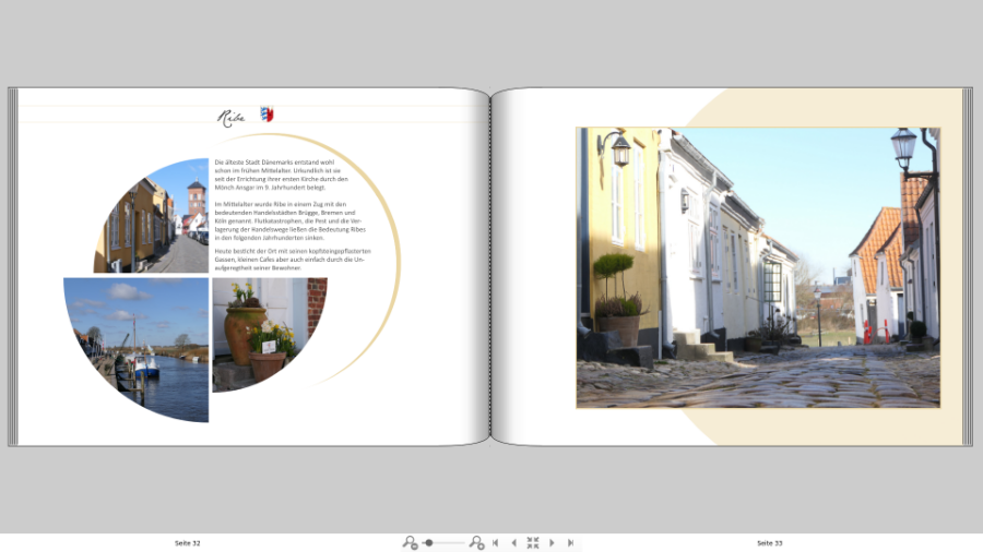 beim Cover sehe ich es genauso wie Spica: Die asymmetrische Fahne hat mich etwas irritiert, also wenn schon Fahne, dann richtig. Mit dem Bild im rechten unteren Rechteck kann ich mich so gar nicht anfreunden, erst recht nicht, wenn das Rot im oberen Bereich durchschimmert. Willst Du es vielleicht mal ohne Bild probieren und dafür die Texte "Dänemark", "Unendliche Weite" und "Hygge" etwas grösser und auffälliger schreiben? Ist die Rückseite mit der Wortwolke schon fertig? Mit so wenigen Begriffen ist es eine recht dünne Schleierwolke, sozusagen. Vielleicht fallen Dir ja noch mehr Schlagwörter aus dem Urlaub ein. Bei der Seitengestaltung gefällt mir die letzte Doppelseite mit Abstand am besten. Dass rechts ein farblich passender transparenter Kreis hinter dem Foto die runde Gestaltung der linken Seite aufnimmt, sieht sehr harmonisch aus. Ich denke, damit bist Du auch am flexibelsten. Wenn Du bei einer Kapiteleinleitung mal kein passendes Foto im Querformat hast, kannst Du auch 2 im Hochformat nebeneinander oder ein quadratisches nehmen. Viele Grüsse