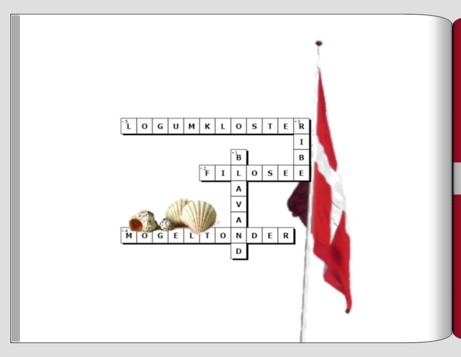 Dänemark ist der Titel und das sollte auf dem Deckblatt auch deutlich erkennbar sein. Mir ist die Schrift zu klein, zu sehr auf die Seite gerückt und die senkrechte Stellung, hm naja, ist auch nicht so meins. Auch die beiden Fotos sind nicht so prickelnd, wobei das erste mir noch besser gefällt. Vielleicht hast du ja noch ein geeigneteres Bild, das nicht so duster ist oder evtl. doch nicht schwarzweiß. Außerdem würde ich dem Bild auch mehr Raum geben und es dadurch mehr in den Blickpunkt rücken, d.h. einfach etwas größer machen und nicht exakt dem rechten unteren Feld anpassen. Ein Rahmen würde das Foto auch besser abgrenzen. Alternativ: Die Flagge über die Titelseite auf die Rückseite ziehen, um die Proportionen beizubehalten und den Titel in den weißen Balken setzen Ich habe mal etwas rumgespielt, vielleicht kannst du mit meinen Ideen ja was anfangen. @spica: Danke für die originelle Idee mit dem Kreuzworträtsel Liebe Grüße