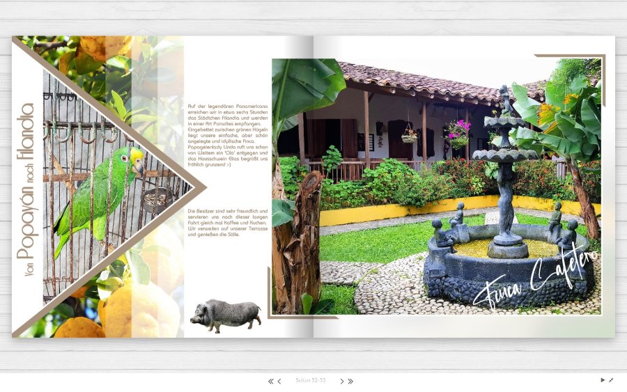 Das Layout mit den Dreiecken aus dem Kolumbienbuch auf Seite 18 von Annette war für mich immer ein Highlight der Fotobuchgestaltung. Jetzt endlich habe ich auch die passenden Fotos dazu. Nur leider scheitere ich an der Ausführung. Vielleicht ist jemand so nett und hilft mir auf die Sprünge.