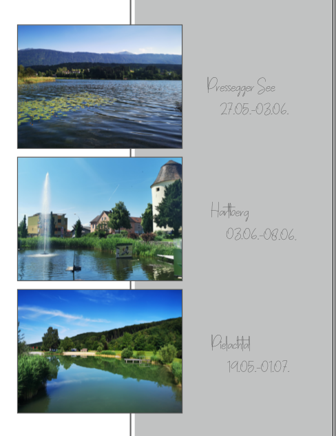 Hallo Anika,Habt ihr noch Änderungsvorschläge ? Liebe Grüße Anika hier mal mein erster Eindruck von Deinen gezeigten Seiten. vielleicht kannst Du noch etwas basteln und die Fotos anders anordnen! Ich persönlich mag es ja auch etwas bunter. Mir hat die Gestaltung Bild 7 von 7 von den Farben (blau und vorallem das Lila) und den Verläufen her besser gefallen. Egal wie Du Dich entscheidest. Auf jeden Fall würde ich das Foto mit den Bäumen auf der rechten Seite ganz weg lassen und beide Fotos in der gleichen Größe. Evtl. sogar den Camper als oberes Foto. linke Seite: Ankommen oder Camping über dem runden Clipart oben setzen und das Foto wie 2 von 7 rechteckig und nur etwas kleiner. Außerdem würde ich das Clipart nicht ausgefranzt, sondern gleich gestalten. Seite 1 von 7: Wie wäre es, wenn Du die Stationen unter die Fotos setzen würdest und Sonne, See und viel Natur waagrecht versetzt auf die Seite. Aber dies ist mein Geschmack. Dir muss es gefallen. Liebe Grüße Asiafan