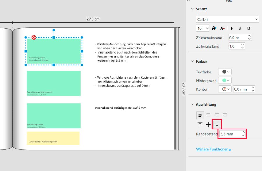 Also nochmal von vorn … Ich habe inzwischen die 7.3.3 heruntergeladen und mir in meinem Testbuch das Verhalten des Rand-/Innenabstands von Textfeldern beim Kopieren/Einfügen angeschaut. Dabei habe ich sowohl die horizontale Textausrichtung (links- bzw. rechtsbündig, zentriert, Blocksatz) als auch die vertikale Textausrichtung (Oben, Mitte, unten) berücksichtigt. Beim Duplizieren der gesamten Doppelseite auf die nächste leere Seite ist alles in Ordnung, d.h. alle Innenabstände sowie die horizontale und vertikale Textausrichtung werden richtig übertragen. Etwas komplexer verhält sich das Ganze beim Kopieren/Einfügen. Bei der vertikalen Textausrichtung OBEN wird der Randabstand richtig übertragen. Dabei ist es egal, ob der Text links- oder rechtsbündig, zentriert oder im Blocksatz geschrieben wurde. Bei den vertikalen Textausrichtungen Mitte und Unten wird der Randabstand auf 0,0 mm zurückgesetzt. * Bei Mitte verhält es sich entsprechend Die vertikale Textausrichtung verhält sich beim Kopieren/Einfügen analog zum Problem Zeichenabstand Mein Betriebssystem ist Windows 10, Testbuch Groß Panorama, Digitaldruck matt, Schriftart im Beispiel Calibri 10 Liebe Grüße