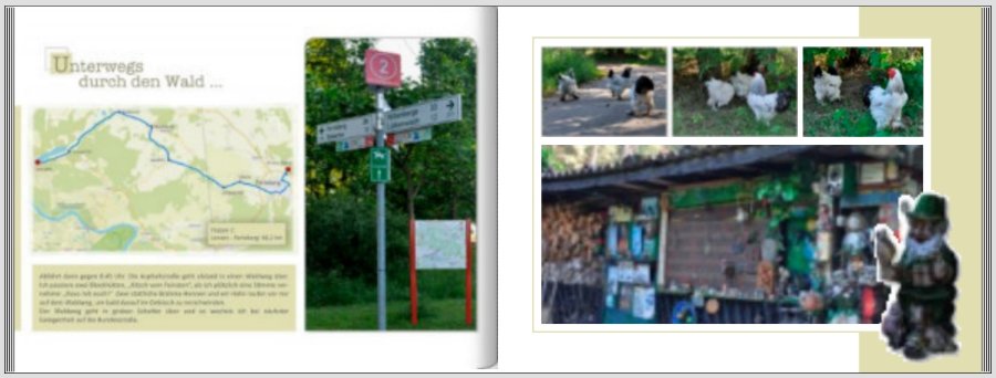 Ich habe jetzt meine Problemseite nochmal vollkommen überarbeitet und das ist dabei rausgekommen: Für die Landkarte habe ich mich jetzt (vorläufig?) für die Maske 111005 entschieden. Eventuell gestalte ich die Karte mit einem angepassten Ausschnitt nochmal, weil die eingezeichnete GPX-Datei an der einen Stelle an den oberen Rand klatscht - das gefällt mir nicht so gut. Frage an Asiafan: Ich habe mir nochmal deinen Vorschlag bezüglich der von Dir vorgeschlagenen Maske 111092 angeschaut. Mir war anfangs nur der stark zerfranste Rand aufgefallen, den Buddha in der linken unteren Ecke habe ich erst jetzt gesehen. Nun kann ich mir die Maske ja sehr gut bei Motiven (oder Landkarten) von Ostasien vorstellen - aber zu einer Radtour in Deutschland? Hast du dich vielleicht verschrieben und eine andere Maske benutzt? (Oder warst du tatsächlich mit dem Rad in Asien unterwegs?). Solche Motivmasken, wie sie in den Rubriken Reisen (Städte) und Sport zu finden sind, gefallen mir schon grundsätzlich (vorausgesetzt das Seitenverhältnis des Fotos stimmt), konnte aber nichts passendes für eine Radtour finden. finden (die farbigen Radmasken 109876 bis 109878) sind nicht so meins. Habe schon versucht, mir selbst was in PSE zu basteln. Auf der rechten Seite habe ich versucht, die Distanz von Kitschhütte und den Hühnern aufzubrechen. Bin gespannt auf Eure Meinungen und Anregungen. Liebe Grüße