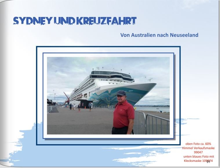 Liebe Spica,Wenn ja, kann ich Dir hier gern nochmals Hilfestellung geben. Bei Deinen aktuellen Entwürfen ist mir persönlich zu viel los. X Rahmen, ein fetter Schatten, Farbfleck, Verläufe ... Da würde ich reduzieren auf das, was Du eigentlich herausstellen möchtest. Einen Wasserfleck würde ich z.B. nicht unter den Asphaltboden legen. Und wie auch schon Traumfänger geschrieben hat, würde ich mich fürs Cover für ein anderes Foto entscheiden. Aktuell ist es ein Schnappschuss von Deinem Mann vor einem beliebigen Hintergrund. Das finde ich schade, da es wenig neugierig auf den Buchinhalt macht. Und es gab doch bestimmt viele besondere Momente und Motive. Wird es einen 3. Teil geben, der Neuseeland an Land beinhaltet? Oder ist das Teil dieses Buches? Vielleicht ist eine Titelidee auch "Von Sydney nach Neuseeland - Unterwegs auf der Norwegian Spirit", wenn es für NZ einen separaten Band geben wird. Sydney wäre dann sozusagen Vorgeplänkel für die Kreuzfahrt. danke erst einmal für Deinen Beitrag. 3D-Effekt, ja so ungefähr wie dein Beispiel. Ich weiß jetzt nicht, wie ich es erklären soll. Etwa so, als wenn das Foto aus dem Rahmen herauskommt.Bei dem Beispiel von Josefia ist es gerade umgekehrt. oder wie wenn ich den Rahmen nehme, natürlich nicht mit dem Aufhänger und auch nicht in dem braun. Zuerst einmal zum besseren Verständnis der Reiseroute. rechts unten Die Halfte des FB habe ich über Sydney gestaltet. Die restliche über die Kreuzfahrt. Ich lege mal die DS mit der Skizze bei. Also außer Sydney noch 3 Stationen in Australien und der Rest in Neuseeland. Erst einmal zu den Foto. Es gibt leider nicht so viele Fotos, auf dem sowohl das Schiff, als auch eine Person darauf ist. (s.Foto der Rückseite). Das einzige, welches ich mir noch vorstellen könnte, ist das Foto bei der Abfahrt in Sydney. Ihr habt ja schon gemerkt, dass meine FB nicht so dick sind. Deshalb bevorzuge ich lieber mehrere FB. Liebe Grüße Asiafan