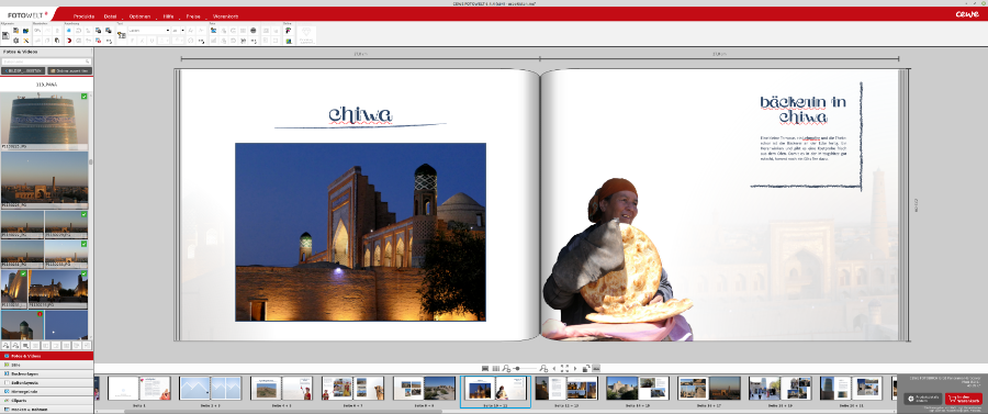 mir ist auf der Brotseite zu viel los - um bei deinen Worten zu bleiben. Ich würde den freigestellten Topf sowie das freigestellte Brot etwas kleiner machen. Das langgestreckte Foto auf der linken Seite und der darüber liegende schmalere Text stören mich. Kannst Du das Foto nicht schmaler, dafür höher machen, das würde auch den Proporionen mehr entsprechen und der Text genauso breit wie das Foto. Re: Neues Projekt - UsbekistanHallo Ihr Lieben, nun ist es vollbracht und mein Usbekistan-Buch steht in den Kundenbeispielen - ohne 'geköpfte Musikerin'. Danke nochmal an Euch alle für die 'guten Augen' und Anmerkungen.