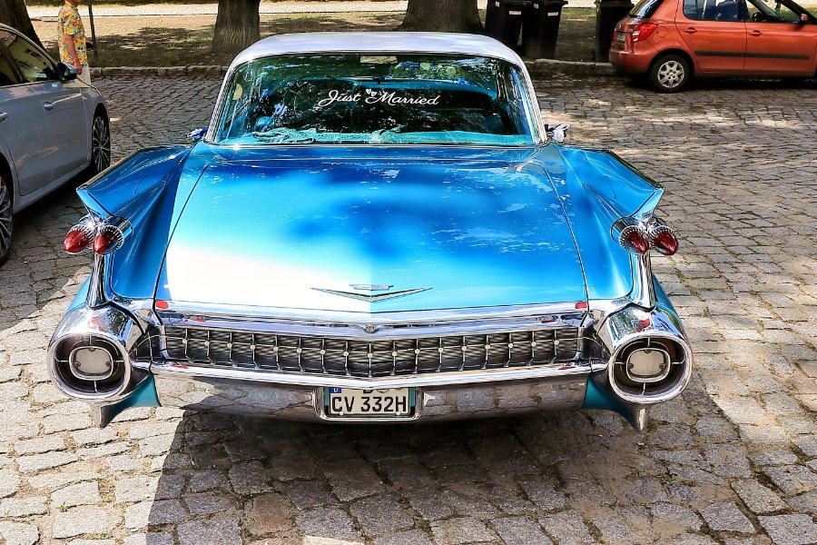 In früheren Zeiten hatten Hochzeitskutschen 2 bis 4 PS, heute dürfen es dann schon mal 325 PS sein. Es empfiehlt sich aber vermutlich, für den Betrieb des Cadillac DeVille 1959 über eine eigene Ölquelle zu verfügen Aufgenommen im Mai an der Woltersdorfer Schleuse bei Berlin.