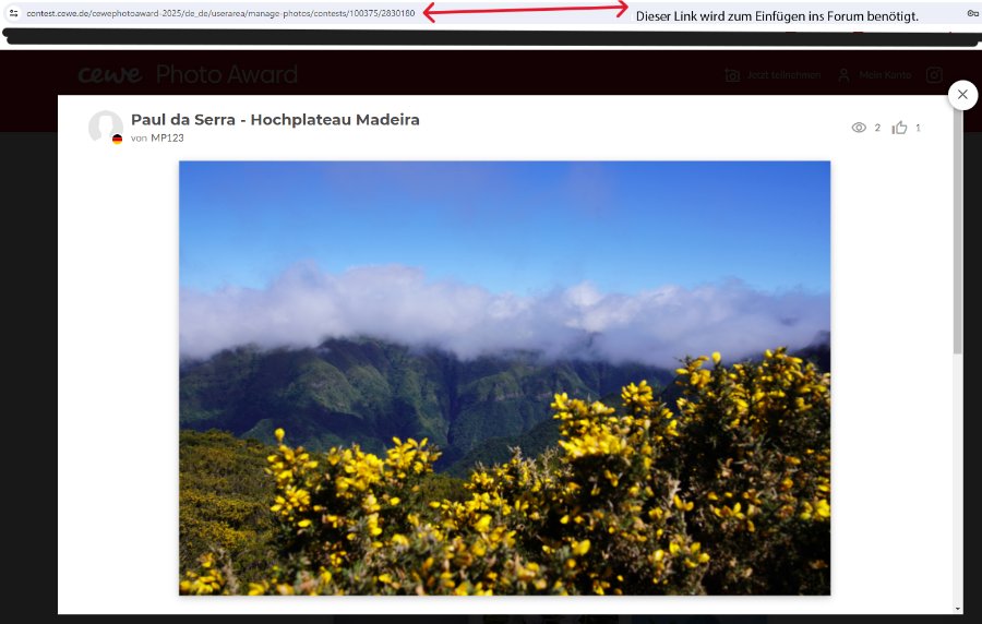 Dieses Phänomen ist mir auch schon aufgefallen. Die Einreichungen von Kunigunde kann ich beispielsweise auch nicht sehen, wenn ich nicht angemeldet bin. Re: CEWE Photo Award 2025 - Challenge: LandschaftenDas mit den gesetzten Links, die zur Anmeldeseite/Startseite von CEWE Photo Award führen, kenne ich auch.