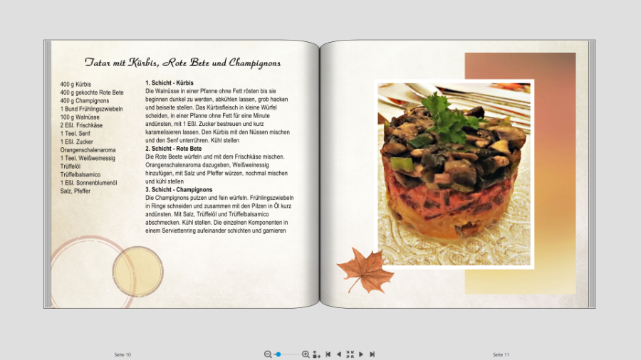 Ja, das sieht schon ganz anders aus. Überlege dir, ob du evtl. die Zutaten noch etwas einrückst, und somit von den Mengenangaben trennst, dann wird es noch übersichtlicher.So in etwa sehen die anderen Seiten aus Screenshot (31).png Screenshot (32).png Ich hoffe, du stellst das Buch dann auch ein. Ich liebe Kürbis und kann immer wieder mal ein neues Rezept gebrauchen LG Monika Wer ist online?Mitglieder in diesem Forum: 0 Mitglieder und 4 Gäste