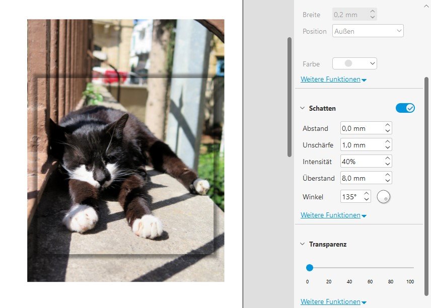Beim Hundebild liegen zwei identische Bilder deckungsgleich übereinander. Das obere wird dann verkleinert auf den gewünschten Ausschnitt. Wichtig ist hierbei, Höhe und Breite separat voneinander zu verändern. Wird die Größe mit geschlossener Kette, also Höhe und Breite gleichzeitig, verändert, ändert sich auch die Größe des Ausschnitts. Das ist hier jedoch nicht gewünscht. Hinter das obere, kleine Bild kommt dann ein Schatten, z.B. mit diesen Einstellungen: Liebe Grüße