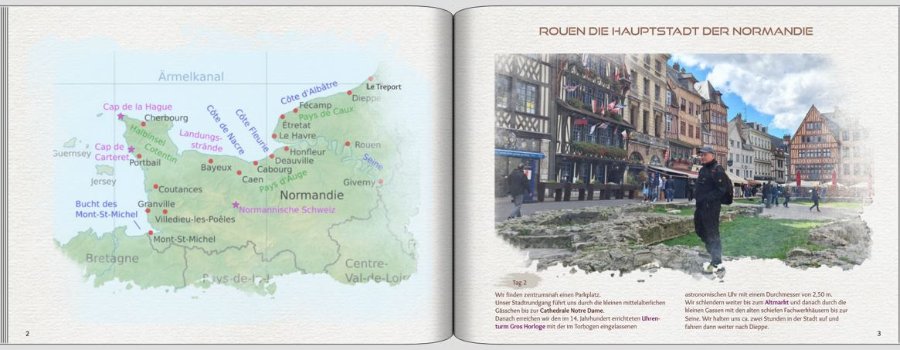Re: Neues Projekt Normandie und BretagneIch gestalte meine Bücher immer so, dass es nach dem Umblättern auf der nächsten Seite links weitergeht. Daher würde ich die Landkarte auch auf der linken Seite platzieren, sozusagen als Kapiteleröffner.