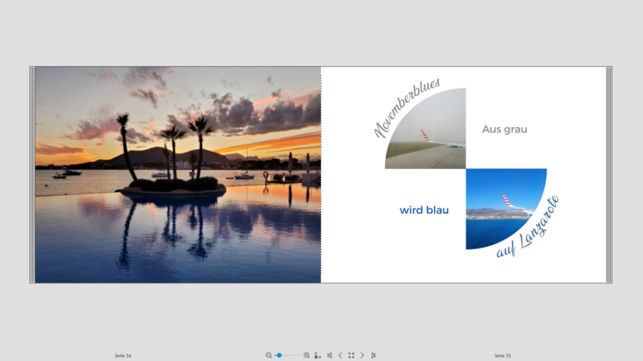 ein frohes, gesundes 2025 mit vielen tollen Erlebnissen wünsche ich Euch. Ich verbringe das Schmuddelwetter vor dem PC und gestalte ein Buch, bei dem ich die Urlaube in Mallorca und Lanzarote zusammen in einem Buch habe. Ich habe allterdings momentan keine zündende Idee, wie ich den Übergang zwischen den Urlauben gestalten soll. Habt ihr Ideen? Re: Übergang zwischen zwei Reisezielen gestaltenDas sieht doch schon mal nicht schlecht aus!