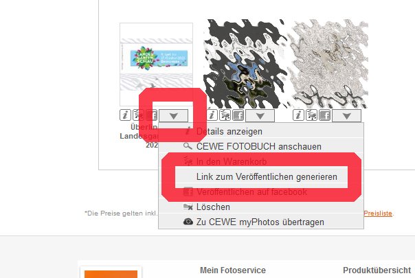 auch direkt über den CEWE FOTOSERVICE kannst du dein CEWE FOTOBUCH - so wie es Silber-Distel für den Handelspartner Müller erklärt hat - über einen Link mit anderen teilen. Gehe dazu bitte wie folgt vor: - Melde dich bitte mit deinen Benutzerdaten auf der Webseite des CEWE FOTOSERVICE (Login/Anmelden) an - Wähle in deinem Benutzerkonto den Menüpunkt „Meine Projekte“ - Unter dem entsprechenden Produktreiter CEWE FOTOBUCH werden deine Bestellungen angezeigt - Direkt unter der Voransicht deines Projektes befindet sich ein nach unten zeigender Pfeil, klicke auf diesen Pfeil und wähle „Link zum Veröffentlichen generieren“ - Du wirst dazu aufgefordert, die Freigabe zur Veröffentlichung zu bestätigen. Dadurch erlaubst du denjenigen Personen die Online-Ansicht, die den entsprechenden Link erhalten. Zusätzlich kannst du diesen Personen auch die Bestellung einer Kopie ermöglichen, falls du das möchtest. Ich hoffe, ich konnte dir weiterhelfen. Bei weiteren Fragen melde dich gern erneut hier oder bei unserem Kundenservice. Viele Grüße [Franzi] Hallo zusammen, meine letztes Projekt ist nun gedruckt worden und ich kann es morgen in meinem DM-Markt abholen. Ich habe mich heute in meinen DM-Account eingeloggt und wollte einen Link generieren, den ich dann an unsere Mitreisenden schicken wollte. Mein aktuelles Projekt kann ich nicht unter "Meine Projekte" finden und konnte daher den Link nicht generieren. Früher war das immer möglich und ich konnte den Link ganz normal per Mail verschicken. Besteht diese Möglichkeit nicht mehr? CEWE myPhotos möchte ich nicht nutzen, zumal meine Freundin die Software auch nicht nutzt. Gibt es eine andere Möglichkeit oder übersehe ich etwas? Vielen Dank für Eure Hilfe. Liebe Grüße Andrea PS. Meine Freunde möchten sich das Fotobuch nur online anschauen und nicht selber für sich bestellen.