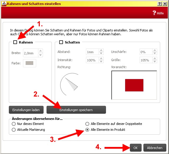 ...also: Version 5.0.1.Wenn du speicherst über den Button innerhalb des Dialogs (oben im Bild Pkt. 2), dann funktioniert das nicht, wie ich und auch @zugvogel08 festgestellt haben. Änderst du in den Optionen und speicherst, dann geht's. In den Vorgängerversionen bis zur 4.8.3 hat das noch funktioniert. Oder funktioniert das bei dir wirklich? Ich klicke auf ein Bild - gehe auf das Rahmensymbol - wähle einen knallgrünen Rahmen und einen Schattenabstand von 7 mm - ok. Dann klicke ich dieses Foto neu an - Einstellungen speichern. Anschließend klicke ich auf irgendein Bild irgendwo im Buch, gehe auf das Rahmensymbol - klicke auf Einstellung laden - und der Rahmen ist knallgrün mit einem Riesenschatten, wie vorab eingestellt. Ich habe dasselbe nochmal mit gelb und lila wiederholt und die zuletzt gespeicherte Einstellung war immer wieder anwendbar. PS: ich habe eben nochmal probiert. Wenn man bei der Rahmenänderung gleichzeitig auf Einstellungen speichern geht, funktioniert es nicht. Man muss den Rahmen/Schatten einstellen und mit ok schließen. Dann nochmal anklicken und jetzt geht auch das Speichern und man kann die Einstellung beliebig anwenden mit "Einstellung laden". Liebe Grüße