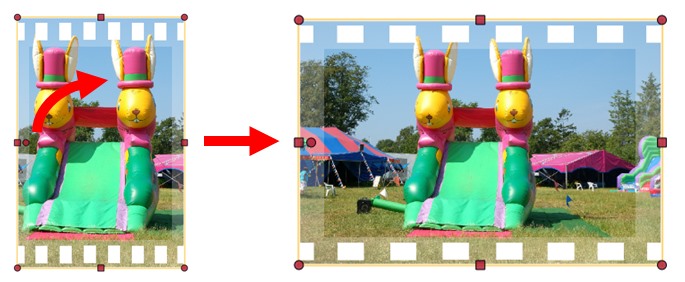 Beispiel: Sie möchten das Passepartout für Negativstreifen verwenden, das immer nur eine Perforation auf der schmalen Seite ergibt, wollen aber einen horizontal verlaufenden Filmstreifen erstellen. Also müßte ich das Passepartout drehen. Passepartouts hängen aber fest am Rahmen, ich muß dazu den Rahmen drehen. Da sich dabei auch das Bild mitdreht, muß ich es anschließend einzeln wieder zurückdrehen. Dabei geht leider das ehemalige Seitenverhältnis verloren. Nach der Anwendung des Passepartouts sieht das dann z.B. erstmal so aus: Die Perforation liegt noch links und rechts statt oben und unten. Also drehe ich jetzt den Rahmen mit Auf diese Weise können Sie eine ganze Reihe von Passepartouts passend zu Ihrem Layout ausrichten, auch wenn diese als Vorlage nicht so angeboten werden, nur das Spiegeln ist leider nicht möglich. Re: Drehen von PassepartoutsSuper Tipp!