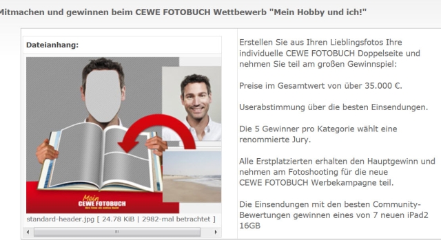 wir haben soeben die Gewinner der Kategorien veröffentlicht. Viel Spaß beim Betrachten und meinen Glückwunsch den Gewinnern! http://contest.cewe-fotobuch.de/mein-ce ... /de/Winner Sylke Re: Wettbewerb: Mein Hobby und ich!Was wurde eigentlich aus dem Fotoshooting für die Gewinner? Wo sieht man denn die Werbung dafür?