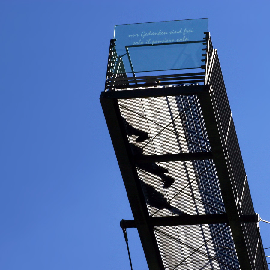 Re: Challenge 02/2013 • Optische IllusionenSchloß Trauttmansdorff bei Meran - eine traumhafte Anlage. Für Schwindelfreie gibt es solche Aussichtsstege, die weit über die steilen Hänge hängend einen grandiosen Rundblick gewähren. Ich finde diese Schattenspiele der Beine der Besucher ganz witzig. Das Bild ist gespiegelt, damit man die Inschrift im Glas besser lesen kann.
