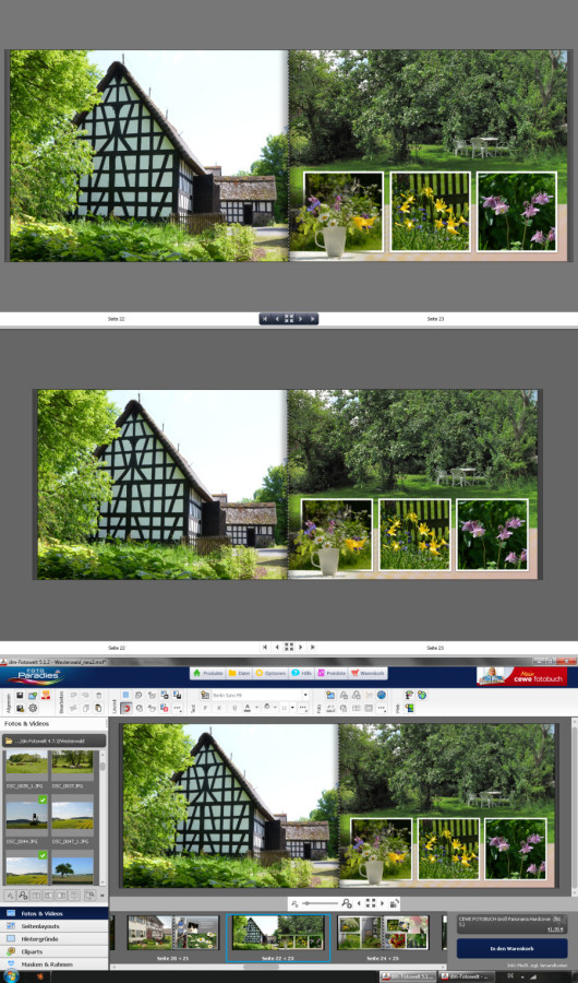 Dafür ist hier die Arbeitsansicht wesentlich kleiner als die des Fotobuchs Panorama, jeweils bedingt durch die freie Arbeitsfläche und die unterschiedlichen Formate. Dennoch gibt es auch beim Fotobuch groß eine Verkleinerung der Vorschau gegenüber den früheren Versionen. Hätte ich zuhause einen Bildschirm wie im Büro, wäre mir das egal. Habe ich aber leider nicht Hier nochmal der Vergleich Fotobuch groß jetzt und vorher. Ich finde, es ist schon ein Unterschied, der sich beim Begutachten der Seiten bemerkbar macht: liebe Grüße