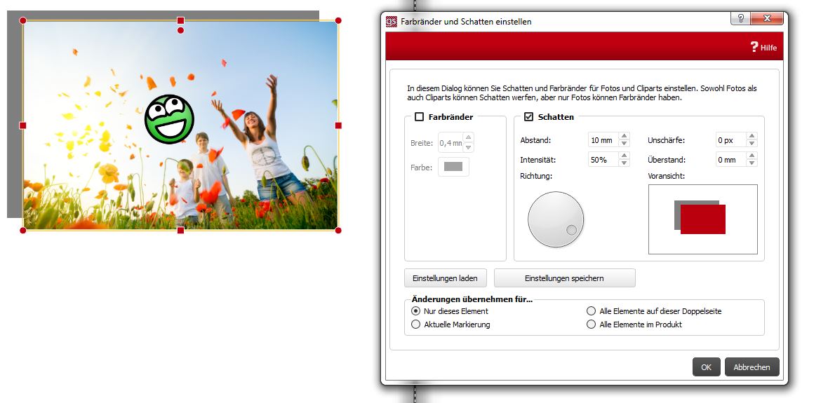 Abstand: Der Schattenabstand zum Bild. Der Schatten selbst gleicht der Bildgröße Intensität: Regelt die Deckkraft des Schattens. Richtung: Regelt die Schattenrichtung bzw. die Position der Lichtquelle Unschärfe: Hier können Sie die Unschärfe des Schattens einstellen. Bei 0 haben Sie eine harte Schattenkante. Setzen Sie diesen Wert höher, so läuft die Kante weich aus. Überstand: Mit dem Überstand können Sie die Größe des Schattens einstellen. Beispiel: das eingefügte Foto ist 10 x 15 cm groß. Der gewählte Überstand beträgt 20 mm. Der Schatten selbst ist somit 12 x 17 cm groß. die Bezeichnung Überstand scheint mir etwas unglücklich gewählt zu sein. Sylke Re: Schatten - Unschärfe, ÜberstandVielen Dank!! Endlich das mit dem überstand verstanden!