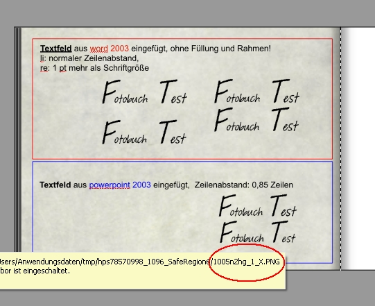 Ja kann ich Vielleicht kann Josefia in PowerPoint 2010 probieren, ob es von dort übernommen wird. Allerdings ist das Übernehmen von Textfeldern auch schon aus früheren Versionen von PowerPoint möglich (OT: nur das Freistellen-Werkzeug gibt es erst ab 2010), daher hier ein Ergebnis aus PP 2003 und aus word 2003. Aus PP wird ja das ganze Textfeld kopiert und so funktioniert es auch in word: Textfeld erstellen, Text eingeben und passend formatieren, "Keine Füllung" und "Keine Linie" einstellen, das Textfeld auf dem Rahmen anklicken, kopieren und im FB einfügen. Im Fotobuch wird dann automatisch eine png-Datei eingefügt (auf dem Screenshot noch im tmp-Ordner, da ich nicht gespeichert habe). Auch hier gilt, wie bei den Fotos: den Text deutlich größer als im Fotobuch gewünscht anlegen und dann im Buch runterskalieren, sonst gibt es "Treppchen" bzw. der Smiley meckert und schreit liebe Grüße