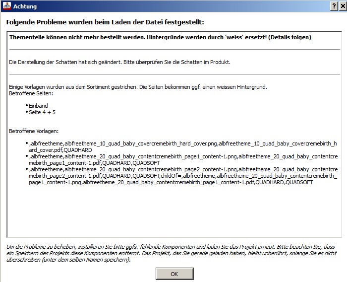 Beim Laden eines solchen Buches in Version 5.1 kommt der Hinweis, dass die Designvorlagen aus dem Sortiment gestrichen wurden. Trotzdem: Die Tatsache, dass Einschränkungen im Sortiment sehr geräuschlos vonstatten gehen, zeigt einmal mehr, dass man die jeweilige Softwareversion, mit der man ein Fotobuch angefangen oder auch fertiggestellt hat, unbedingt aufheben sollte. Nur dann ist wenigstens einigermaßen gewährleistet, dass man bei Bedarf noch Bestellungen oder Nachbestellungen durchführen kann. Wer ist online?Mitglieder in diesem Forum: 0 Mitglieder und 15 Gäste