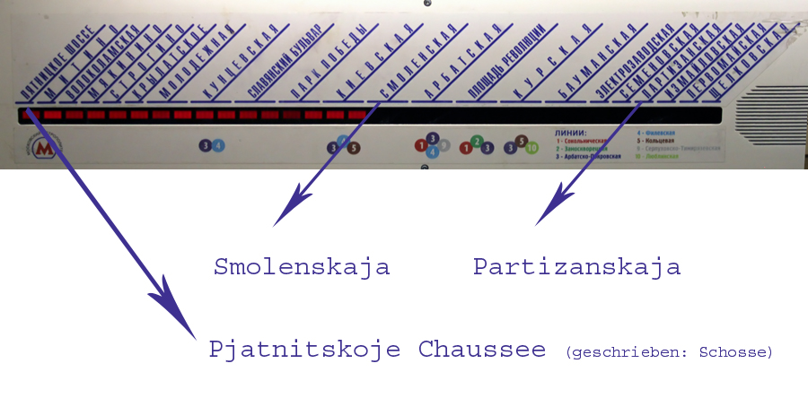 Moskau auf eigene Faust ist aber nur empfehlenswert, wenn man sich zumindest ein wenig verständigen und die Schrift lesen kann. Ansonsten ist es mit Reiseleitung besser. Unser Sohn hat sich vor ein paar Jahren einen PC-Russisch-Kurs angeschafft und fleißig gelernt, er kommt ganz prima zurecht und hat uns problemlos durch die Metro-Labyrinthe gelotst und erklärt, was wir essen wollen :P .... Liebe Grüße
