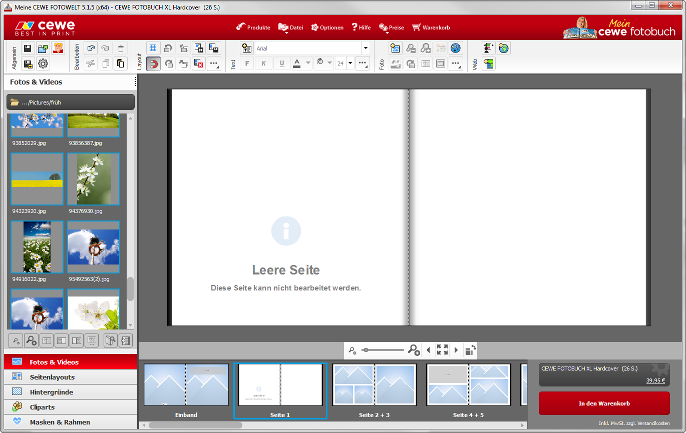 Wenn alle Layout zu Ihrer Zufriendenheit sind, können Sie die Bilder auswählen, die Sie in Ihrem Projekt haben möchten. Ziehen Sie wenn Sie Ihre Auswahl getroffen haben, alle Bilder auf die erste Seite oder den Einband der Vorschauleiste.