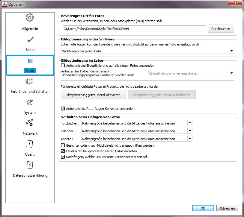 Ich gehe davon aus, dass du in den Optionen unter "Fotos" "Bildoptimierung im Labor" schon "Bildoptimierung immer ausschalten" für die bearbeiteten Fotos eingestellt hast. Ein Klick auf den Button "Bildoptimierung jetzt überall ausschalten" schaltet die ABO für unbearbeitete bereits eingefügte Fotos aus und bezieht auch die bearbeiteten mit ein, wenn die Einstellung wie oben genannt gesetzt ist. Das heißt, bevor du dein Buch bestellst, klickst du (bei oben genannter Einstellung) auf "Bildoptimierung jetzt überall ausschalten" und alles ist ausgeschaltet. Ist der Button ausgegraut, zeigt das an, dass nirgends eine ABO eingeschaltet ist. Ich fände es auch schöner, wenn die ABO nur das machen würde, was ich will. Dank des "Ausschalters" finde ich das Problem aber nicht so gravierend, dass ich deshalb von der 5.1.5 abraten würde. Dass eine Liste mit bekannten Problemen einer Version in diesem Zusammenhang hilfreich wäre, wurde im Forum schon häufig angemerkt. Nachtrag, danach hattest du ja auch gefragt: Diese Einstellungen sind die Grundeinstellungen. liebe Grüße