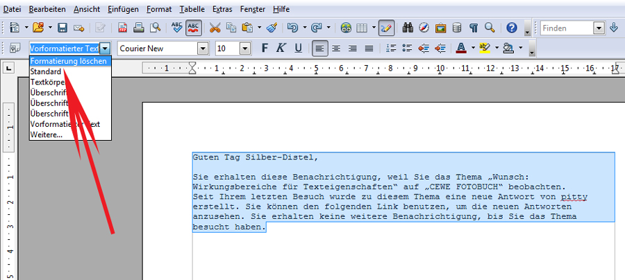 Silber-Distel Re: Wunsch: Wirkungsbereiche für Texteigenschaftenpitty hat geschrieben: Da ich bei längeren Passagen den Text vorher in word schreibe, kontrolliere, korrigiere etc., wäre es wichtig, dass die dort (vor)eingestellten Attribute nicht übernommen werden. Oder es sollte - so wie z.B. in Layoutprogrammen üblich - die Option angeboten werden.