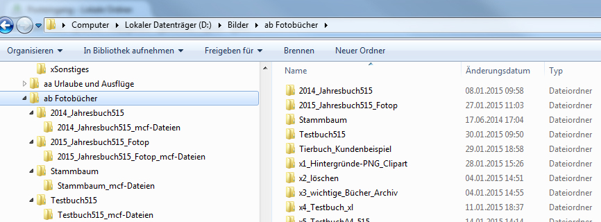 Ich ordne meine Fotobuch-Dateien folgendermaßen: Unter meinem Über-Ordner "Bilder" habe ich einen Unterordner "Fotobücher". Bevor ich ein neues Buch anfange, lege ich dort einen weiteren Unterordner mit dem Inhalt des Buches an. Z.B. "2014-Gardasee515" und speichre dorthin das entsprechende neu angelegt Fotobuch (erstmalig mit "speichern unter", dann bei Fertigstellen einer Seite nur noch mit "speichern"). Wenn ich nun das fertige Buch vor mir liegen habe und alles in Ordnung ist, brenne ich den kompletten Ordner auf CD und schreibe die jeweilige Programmversion wegen der Übersichtlichkeit gleich auf der CD dazu. So kann nie ein Datenverlust entstehen und Du hast immer das komplette Buch gesichert. Da ich auch "fast" alle Programmversionen auf meinem Rechner habe, mit denen ich bisher gearbeitet habe, kann ich auch ziemlich alte Bücher noch öffnen. Wichtige Dokumentationen, die ich für Nachbestellungen evtl. noch brauche, habe ich sogar wieder neu eingelesen und in einer aktuellen Version vorsichtshalber nochmal gesichert. Bei umfangreichen, aufwändigen Büchern, an denen ich auch schon mal mehr als ein Jahr sitze, ziehe ich die Daten gegebenenfalls dann und wann auch mal zur Sicherheit auf einen Stick, dass nichts passieren kann.... Ich bin eigentlich recht unwissend bei fast allem, was sich in den Tiefen meines PCs abspielt. Zu meiner Schande muss ich gestehen, dass sogar bei einem ganz banalen Download eines Programms immer mein Sohn zur Sicherheit hinter mir stehen muss, dass ich auch nichts falsch mache :oops: . Vielleicht bin ich gerade deshalb so penibel darauf bedacht, dass ich möglichst alle Unabwägbarkeiten ausschließen möchte Bei mir sieht das dann so aus: (das Jahresbuch 2014 ist inzwischen gebrannt und wird demnächst hier gelöscht, die anderen ohne Versionsnummer sind in der Hauptsache Sammlungen zum Thema und entstehen erst - die werden zu gegebener Zeit genau benannt. Momentan ist die Liste kurz, da die Urlaube 2015 erst kommen und die restlichen Ordner entweder ins Archiv gewandert oder bereits gelöscht sind.....) Liebe Grüße