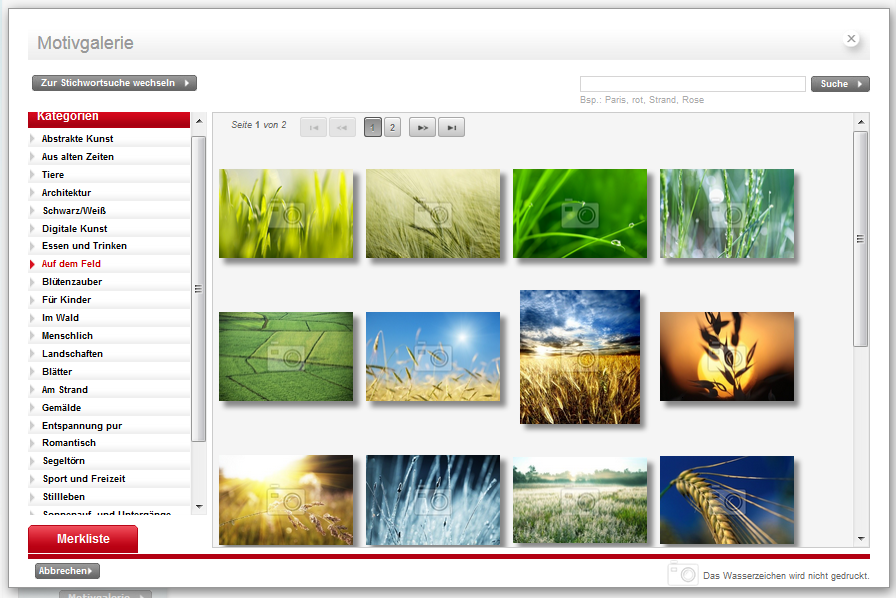 Mit einem Klick auf den Button „Motivgalerie“ geraten Sie direkt in die Auswahl zwischen bis zu 21Millionen Motiven. Vom Tiger bis hin zu Skyline – hier können Sie entspannt online nach dem richtigen Bild suchen.