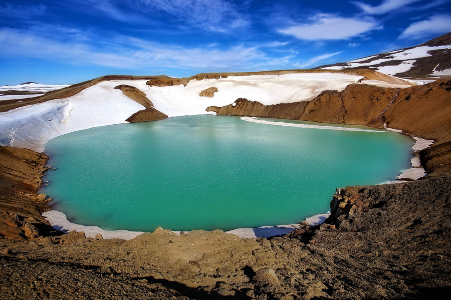 Sonja Re: Challenge 09/2015 • Es klappert die Mühle...Es schaut ja gar nicht so schlimm aus, aber dieser vulkanische See auf Island heißt Viti, was so viel wie Hölle heißt, weil da der Eingang zu ebenjener sein soll. Die Farbe kommt übrigens von Kieselsäurealgen.