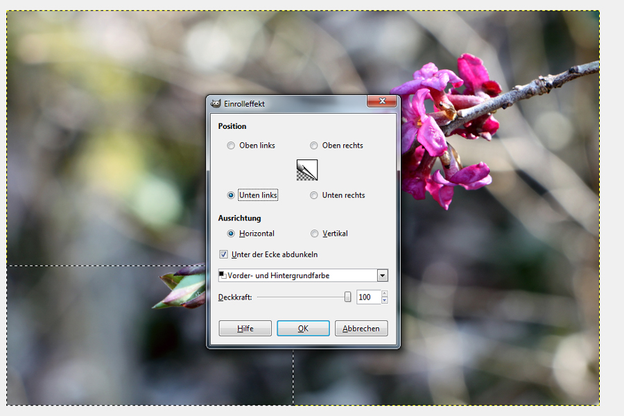 Hallöchen meine frage bezüglich zur auswahl setzenhabe gerade Gimp ausprobiert. Geht wirklich gut. Wenn man übrigends nur eine kleine Ecke haben will und nicht aus dem anliegenden Eck ausgehend, dann vorher eine Auswahl setzen. Dann wird das Einrollen nur in der Auswahl angewandt. wie oder wo bei gimp macht mann das