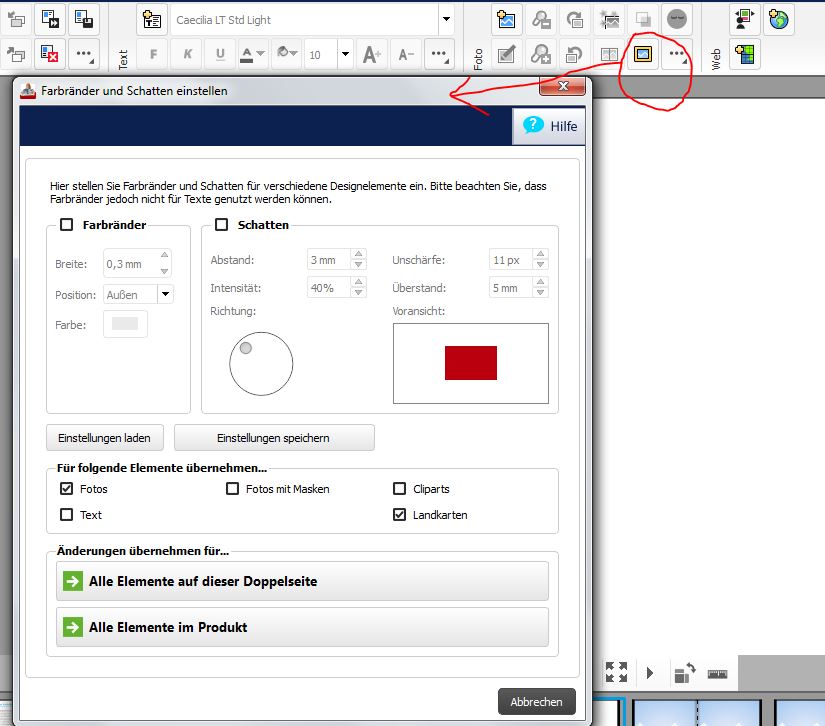 den Dialog kannst Du oben in der Menu-Leiste aufrufen (s. Screenshot) - Bei markiertem Bild Alt + B - rechte Maustaste, dann im aufgehenden Fenster in der unteren Hälfte "Farbränder und Schatten anklicken Liebe Grüße