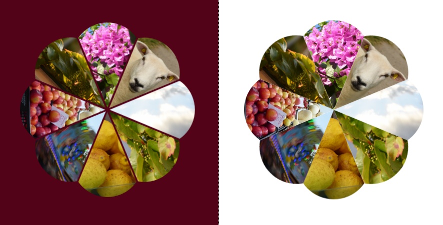 Das geht, es hängt vom Format ab. Ich habe das vorhin mal getestet. Dabei habe ich zuerst die Formen ganz dicht aneinander gelegt, um die Abstands-Breite besser zu erkennen, und habe dann das Format geändert, bis die Breite (augenscheinlich) gepasst hat. Meine Fotos hatten dann ein Maß von 10x8,3 cm, also ein Format von 1:1,2 (das gilt nur für die Gestaltung mit 8 Fotos). Anschließend habe ich (nach bewährter Methode Ich finde aber, Hellens Gestaltung mit den schmaler werdenden Abständen sieht eher nach Blüte aus. Eine Gestaltung mit gleichmäßigen Abständen sieht eher ornamental aus liebe Grüße